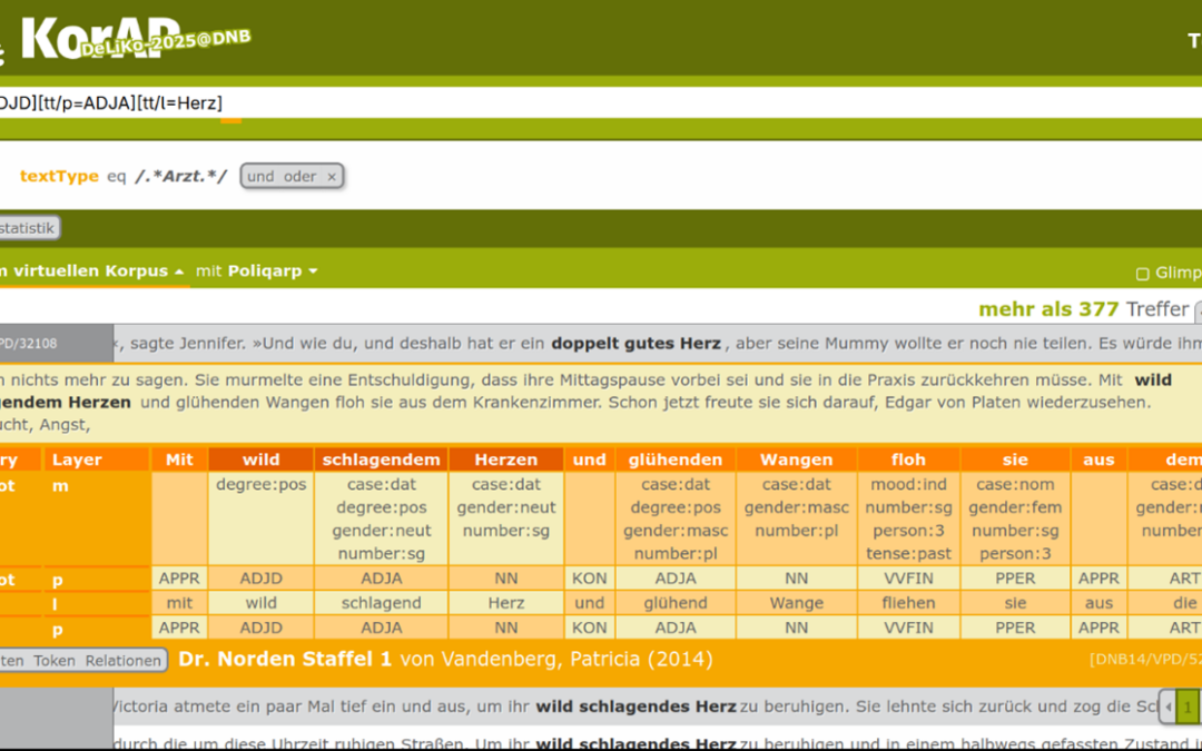 Fiktionale Texte sind aufgrund hoher Lizenz- und Aufbereitungskosten in den gängigen deutschen Referenzkorpora stark unterrepräsentiert. Text+ schafft mit DeLiKo-XL@DNB einen möglichen Ausweg aus diesem Dilemma. Darin erschließt die Deutsche Nationalbibliothek (DNB) zusammen mit dem Leibniz-Institut für Deutsche Sprache (IDS) erstmals einen umfangreichen Bestand für die Forschung.